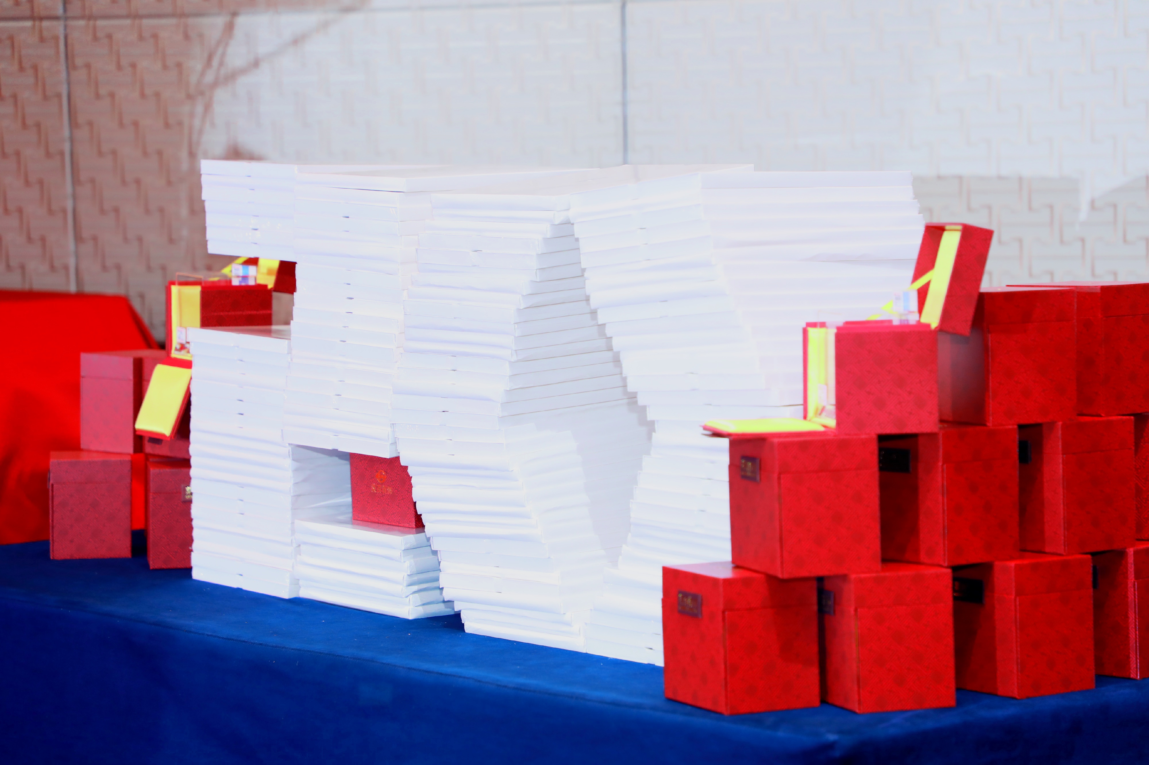 中源公司的传统是每五年都会制作一份精美的纪念品送给在职员工,第三篇章为“礼品创意介绍”,本次20周年的纪念品除了传统的金摆件之外,还增加了公司20周年定制邮册,邮册中的每一张邮票背后都饱含深意。公司领导按照入职年份对在场员工进行了20周年庆典纪念品的颁发。