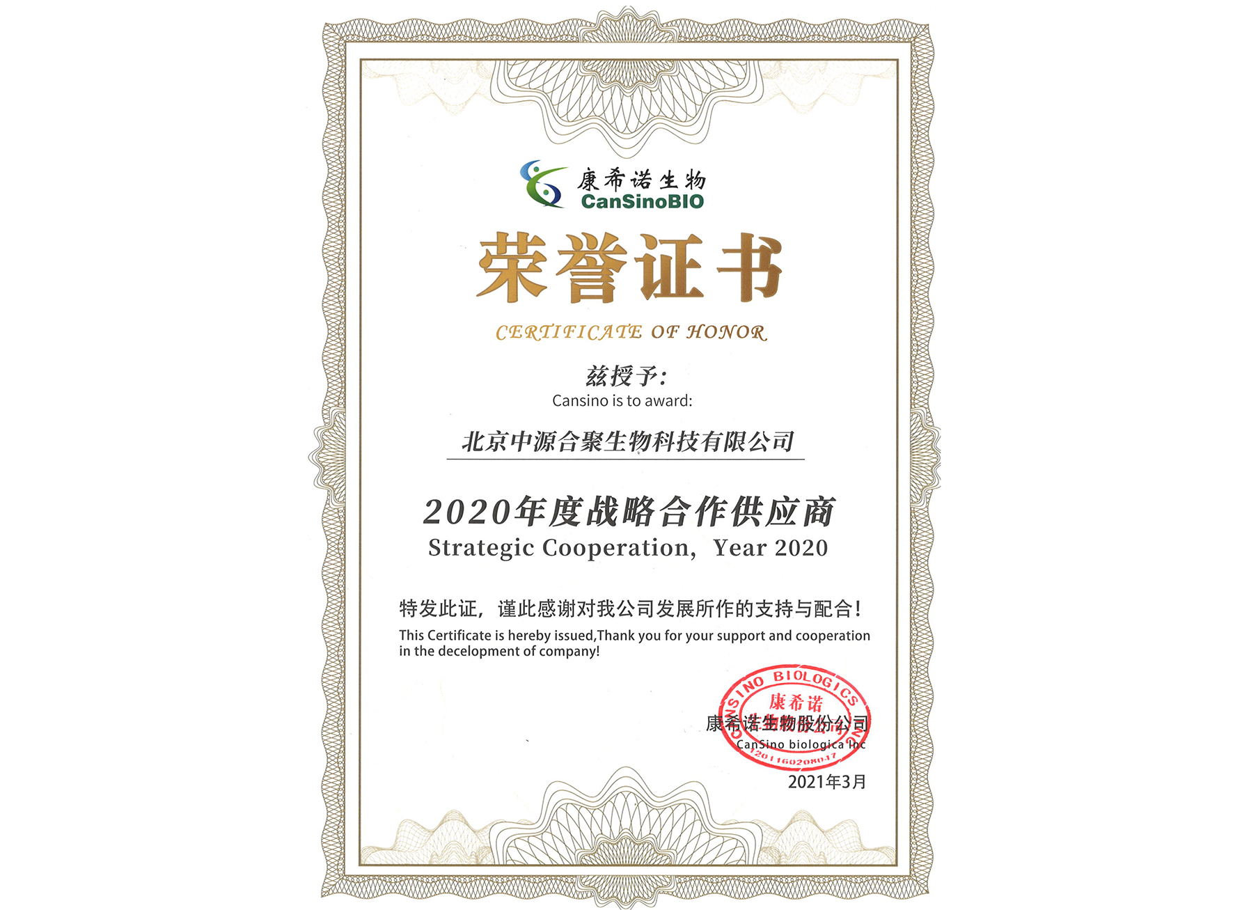 康希诺生物“2020年度战略合作供应商”