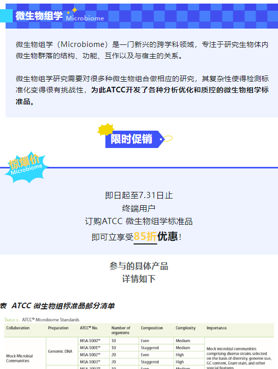 即日起至7.31日止 终端用户 订购ATCC 微生物组学标准品 即可立享受85折优惠!2024-06-14 13:48:00.0