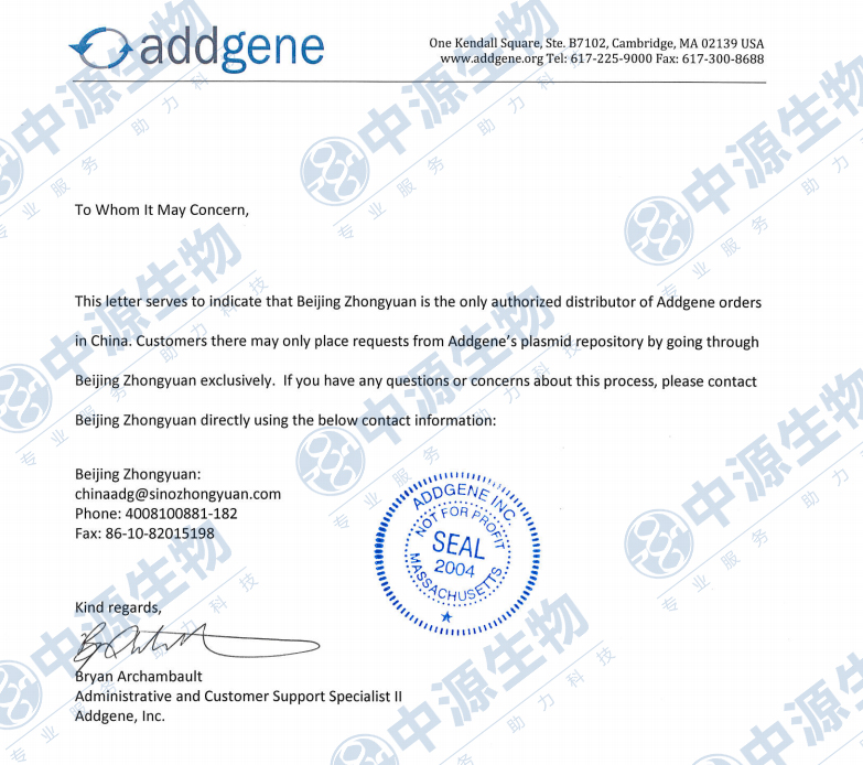 北京中源是Addgene中国大陆独家授权代理商