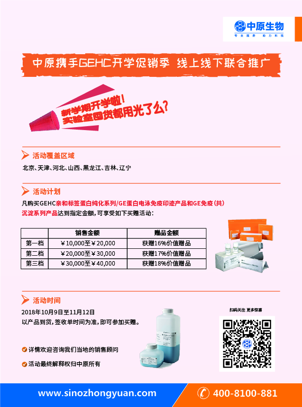 GE Healthcare的产品包括分子生物学试剂、电泳仪器、层析设备、层析介质、膜分离、分光光度计等,涵盖了从上游分子生物学到下游生物大分子分离纯化的全部过程。值此开学之际,中原携手GE healthcare感恩回馈。(促销产品和赠品清单详见文末附件)