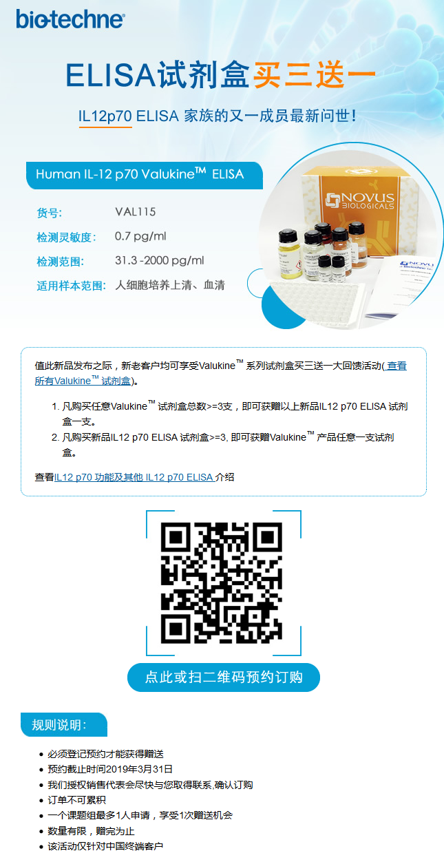2)凡购买新品IL12 p70 ELISA 试剂盒>=3, 即可获赠Valukine TM 产品任意一支试剂盒。