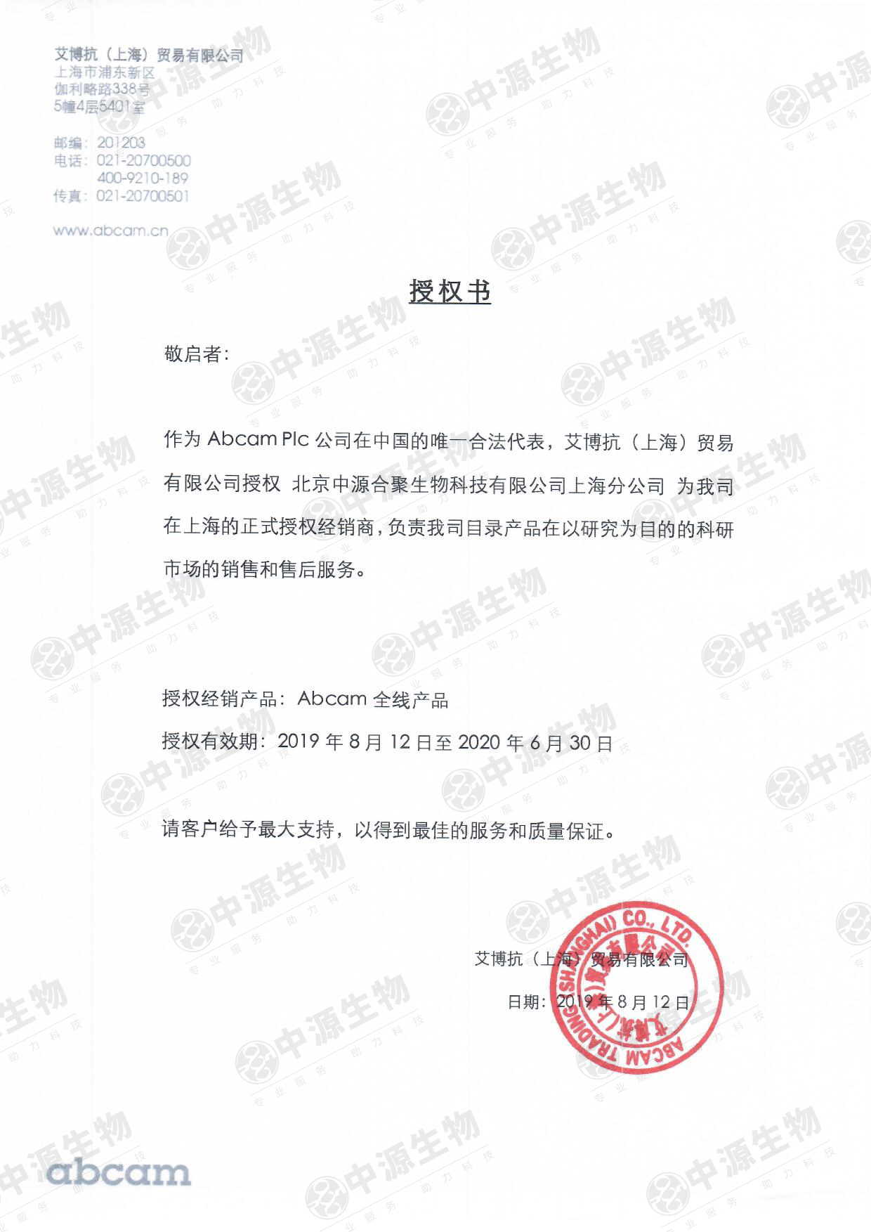 近年来,随着合作的不断加深,2019年8月起,B体育最新官方-B体育(中国)在原代理区域(北京、天津、内蒙古、青海、西藏、宁夏)的基础上新增了Abcam上海地区代理权,B体育最新官方-B体育(中国)将一直秉承“专业服务,助力科技”的宗旨,一如既往的为客户带来优质的产品和更好的服务。