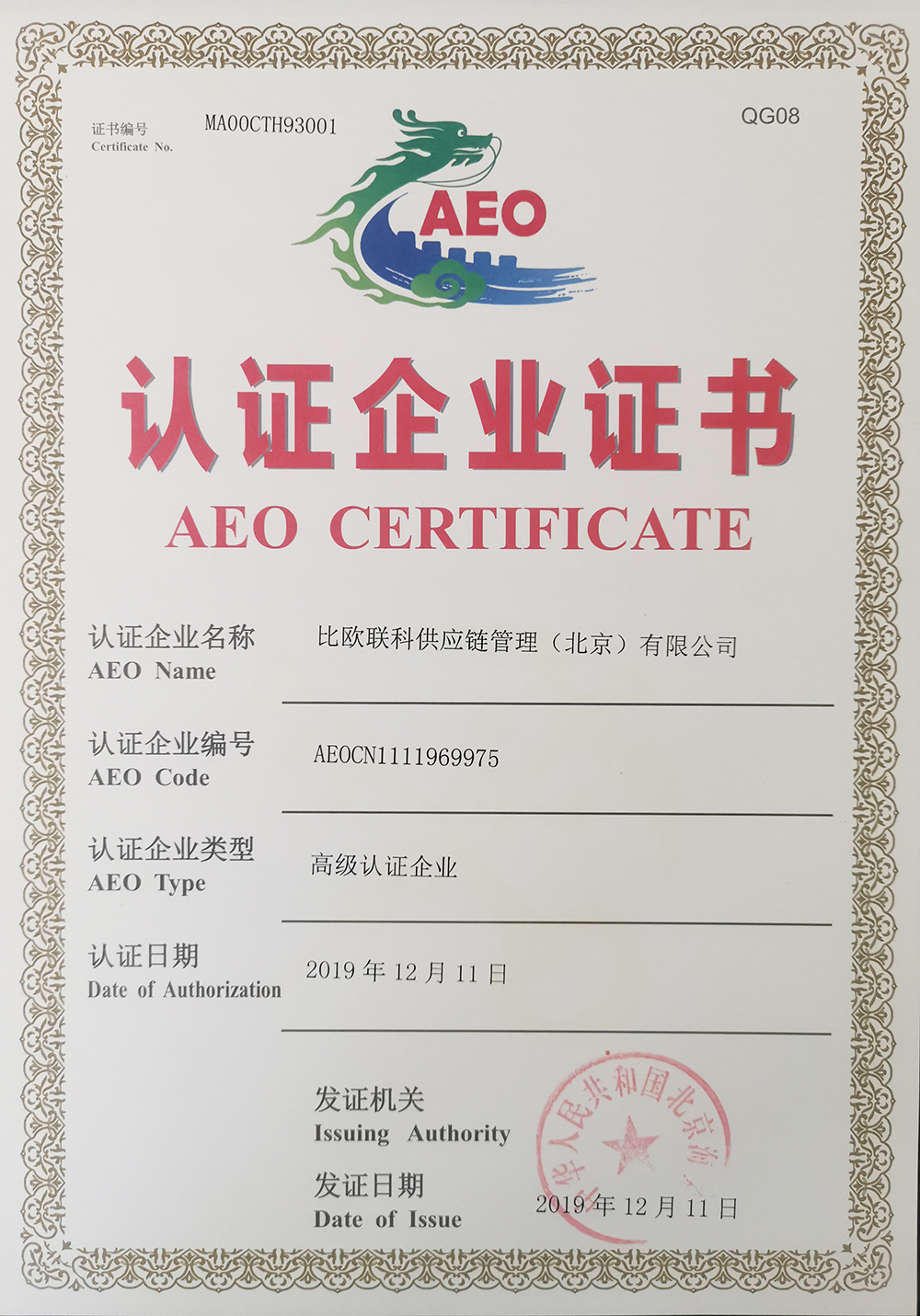 比欧联科供应链管理有限公司成为海关AEO高级认证企业