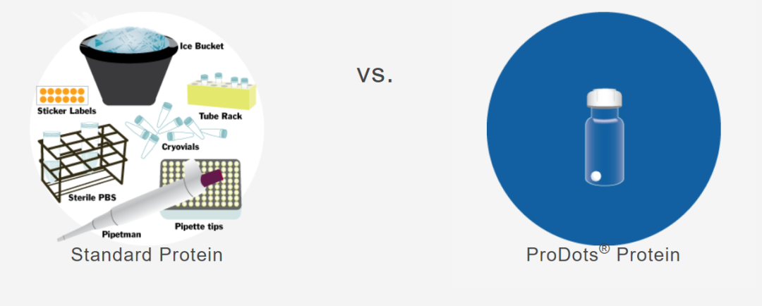 ProDots® 小球是由 Bio-Techne 子品牌 R&D Systems® 研发的可视化即溶型蛋白,可以直接倒入培养基中,无需重溶及分装,避免了反复冻融造成的蛋白损失和繁琐的实验操作。ProDots® 和常规蛋白在生物活性上是没有差别的,并且可以确保最佳的蛋白回收率。