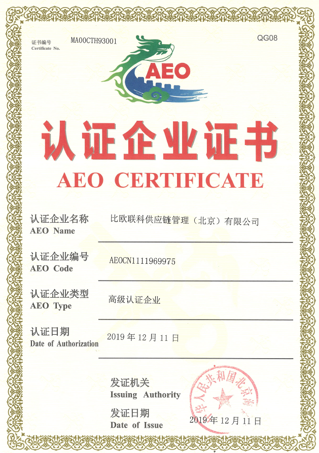 比欧联科供应链管理(北京)有限公司持有AEO高级认证企业证书,这意味着我司在内控管理、风险控制、信息化管理等方面得到海关的认可,标志着我司将享有优先通关放行、较低查验率、AEO互认国家或地区海关提供的通关便利,有助于国际国内商务合作展开,维护国际品牌形象,缩短办理时间,降低供应链及通关成本。