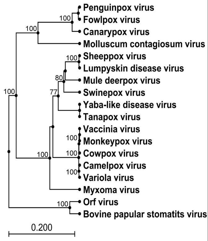 猴痘病毒进化树,From: Phylogenetic analysis of three genes of Penguinpox virus corresponding to Vaccinia virus G8R (VLTF-1), A3L (P4b) and H3L reveals that it is most closely related to Turkeypox virus, Ostrichpox virus and Pigeonpox virus