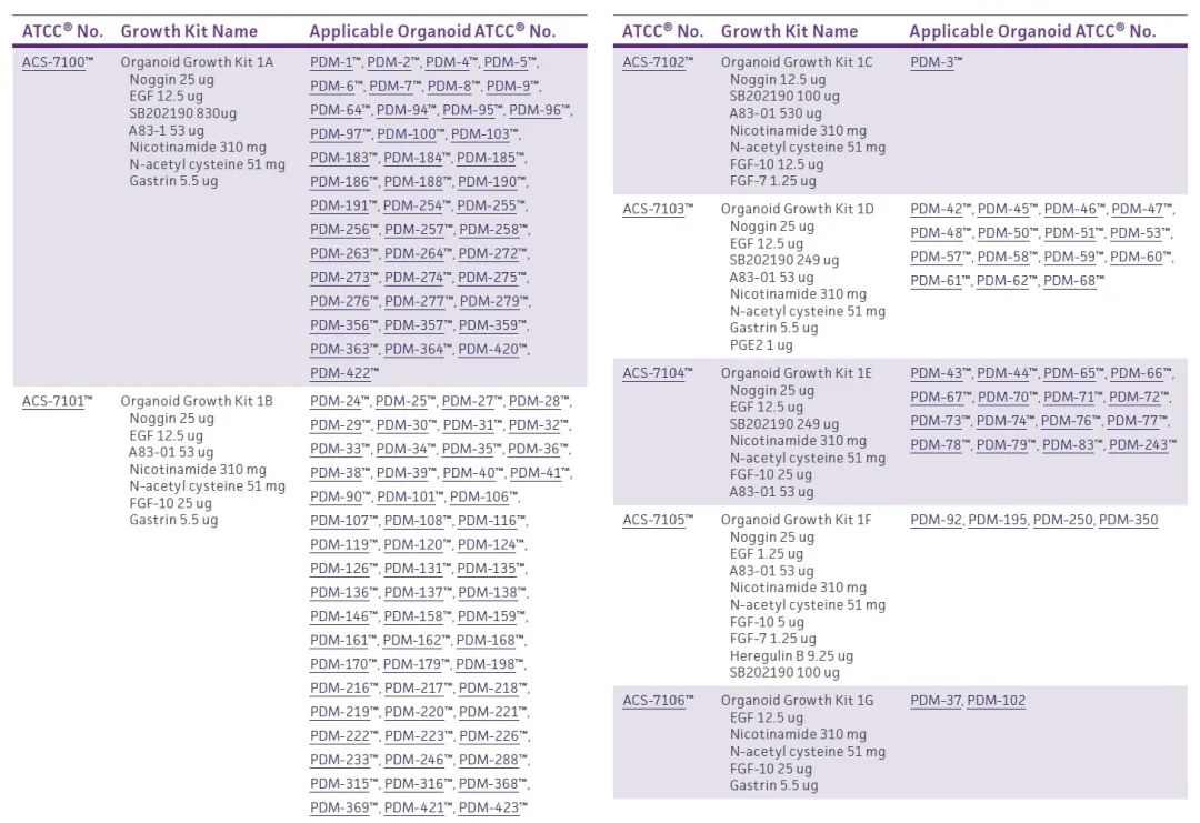 ATCC目前有7款类器官培养所需的添加剂试剂盒(ACS-7100至ACS-7106),适合于ATCC收藏的列表中的类器官产品。