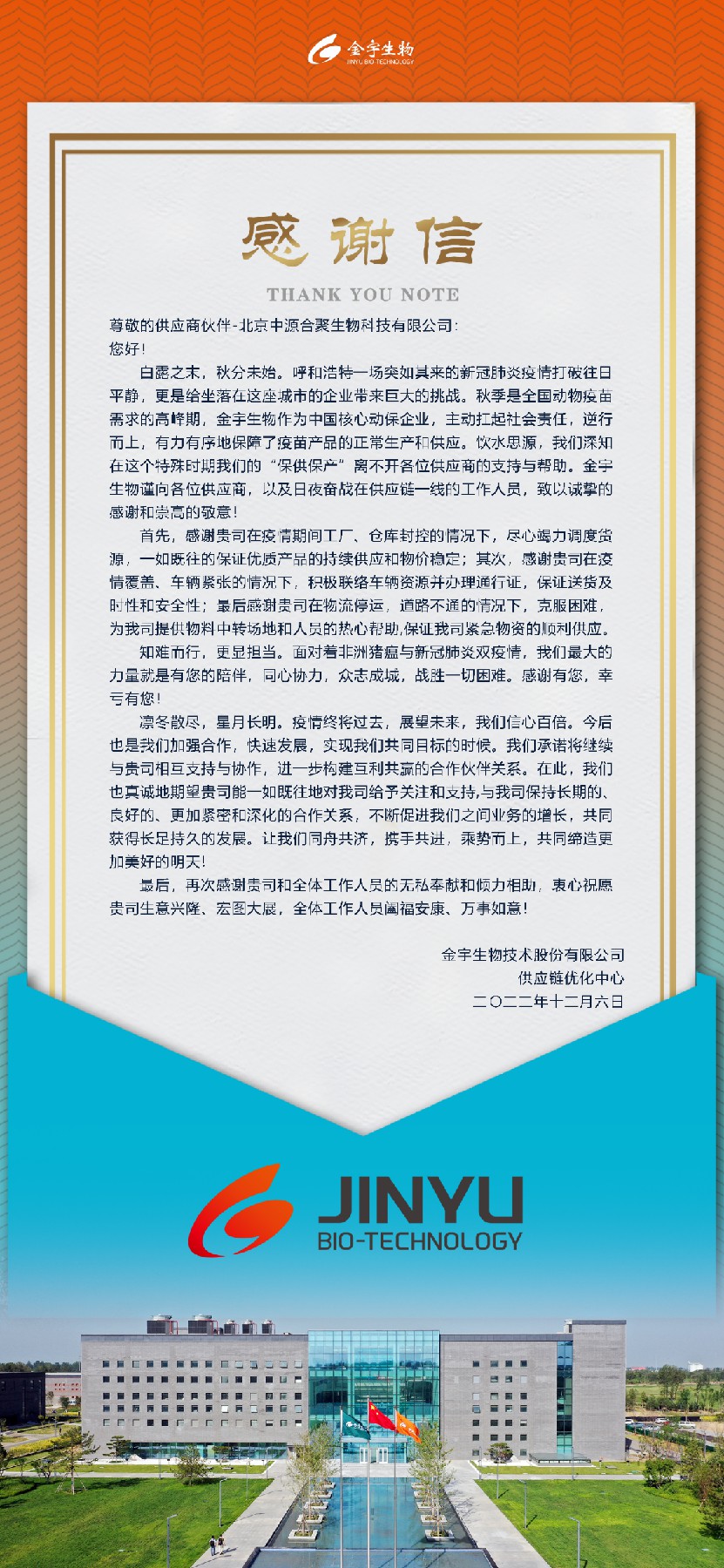 近日,金宇生物技术股份有限公司(以下简称“金宇生物”)发来感谢信,对我司在呼和浩特疫情突发期间为疫苗产品“保供保产”做出的贡献表示衷心的感谢。