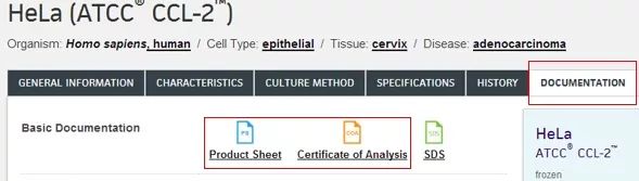 ATCC每个细胞株都有一份产品说明书(product sheet),其中包含细胞株的信息和详细的操作指南。此外,ATCC可以提供具体生产批次的检测报告(COA),其中包含批次的特定信息,如每只冻存管中细胞的数量,微生物污染的检测结果等。细胞株的所有详细介绍可以在 ATCC 网站找到,产品说明书和COA可以从ATCC网站下载。