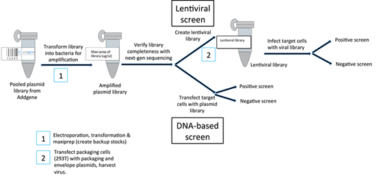 对于某些文库,质粒DNA可以直接递送到细胞内。而其他的,特别是集合慢病毒质粒的文库,必须先用于制造病毒。随后,用这种混合病毒将质粒运送到靶细胞。无论什么情况,都建议对大规模制备的 DNA进行二代测序,以验证文库的完整性。不完整的文库可能导致在以后的实验中出现假阳性或假阴性,并可能对数据的重现性产生负面影响。