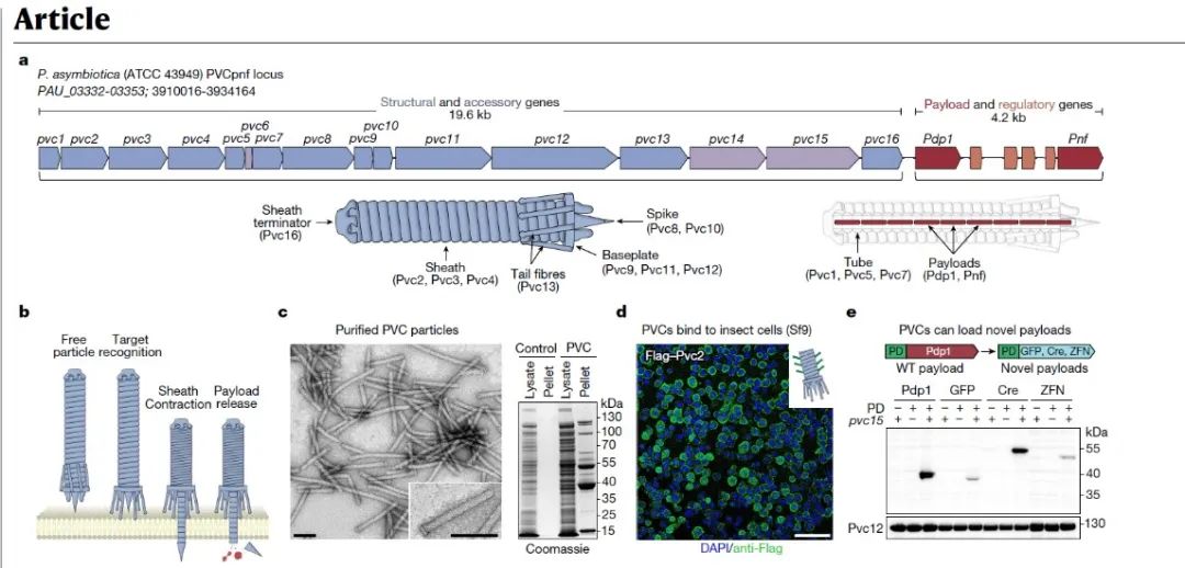 在这项最新研究中,张锋团队首先选定了eCIS的一个亚型——Photorhabdus virulence cassette(PVC)。PVC由一个约20kb的操纵子组成,包含16个核心基因(pvc1-16),以及下游的有效载荷Pdp1和Pnf。研究团队发现,PVC有效载荷蛋白的N端高度无序区域是其“包装结构域”,只要将其与想要递送的蛋白(例如GFP)融合,就能将其加载到PVC复合体中。